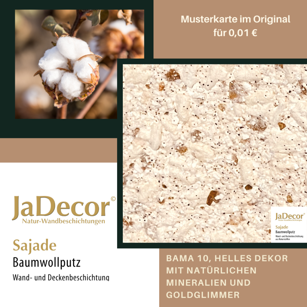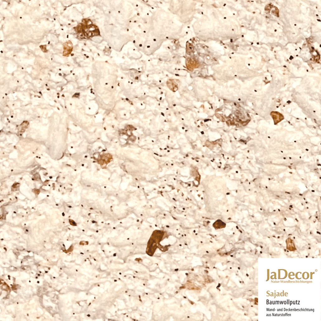 Das cremefarbene Dekor mit leicht glänzenden Mineralien und dezentem Gold Glimmer bietet Ihnen ein besonderes Design. Baumwollputz SaJade Bama 10 wirkt lebendig und beruhigend zugleich.
