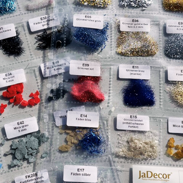 Um Ihnen eine Vorstellung von den Möglichkeiten zu geben, bieten wir Ihnen unsere Effektkarte an. Hier sehen Sie, welche Mineralien, wie Mica, Silber- oder Goldglimmer, Perlmutt oder Kupferfäden, in verschiedenen Größen zur Verfügung stehen. Mit diesen Effekten können Sie Ihrem Design eine besondere Note verleihen und für einen einzigartigen Look sorgen.